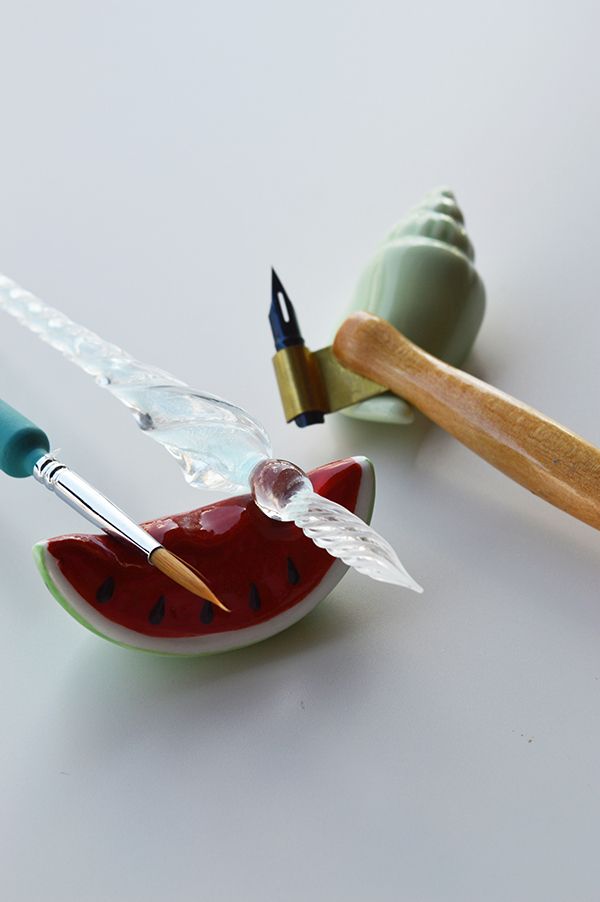 Suportul din ceramica pentru pensule sau tocuri oblice caligrafie, este disponibil in 9 modele noi, sub forma unor diverse animalute, obiecte sau fructe si adauga un strop de farmec biroului vostru de creatie.