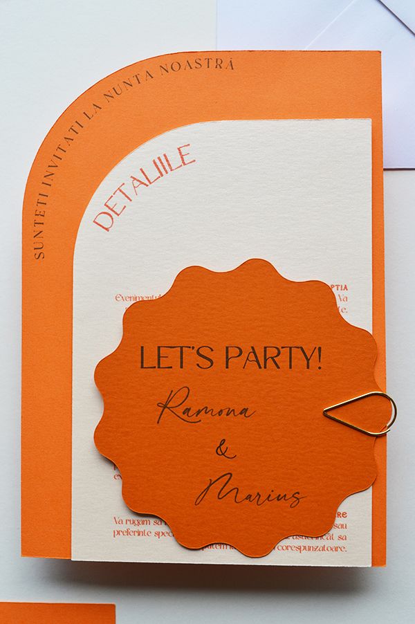 Disponibila in nuante de ivoire si portocaliu, fiecare set va fi prins cu o agrafa minimalista, optionala, in cazul in care poate doriti un plic in loc de agrafa.
