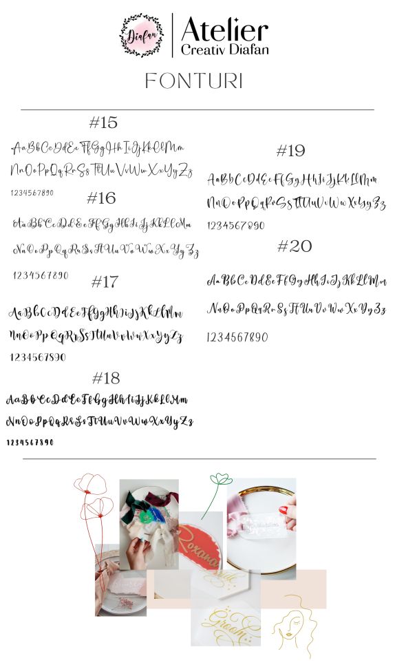 Puteti selecta fontul din imaginile atasate fiecarui produs, exclusiv pentru modelele personalizate care includ DOAR numele simplu al invitatului, fara alte detalii precum flori sau alte ornamente.