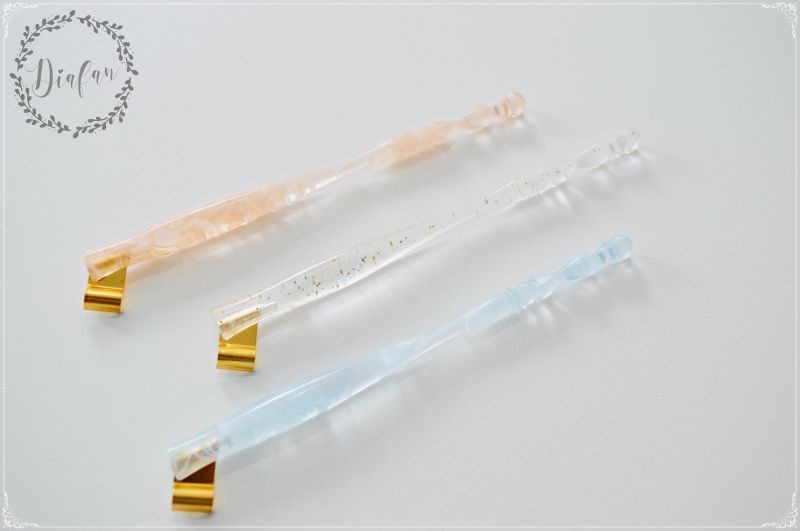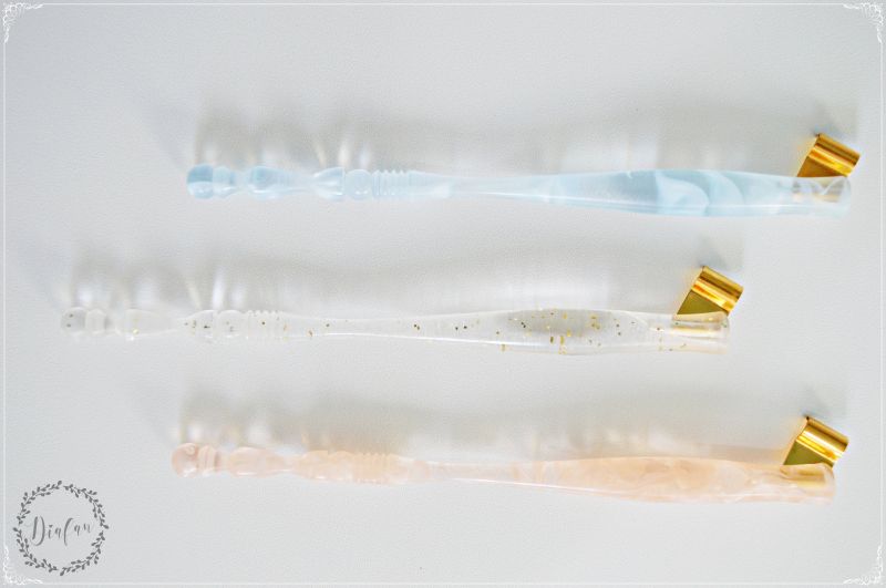 Tocul oblic pentru caligrafie este disponibil in trei culori: alb transparent, albastru pastel si somon pastel, oferind o optiune estetica pentru fiecare preferinta.